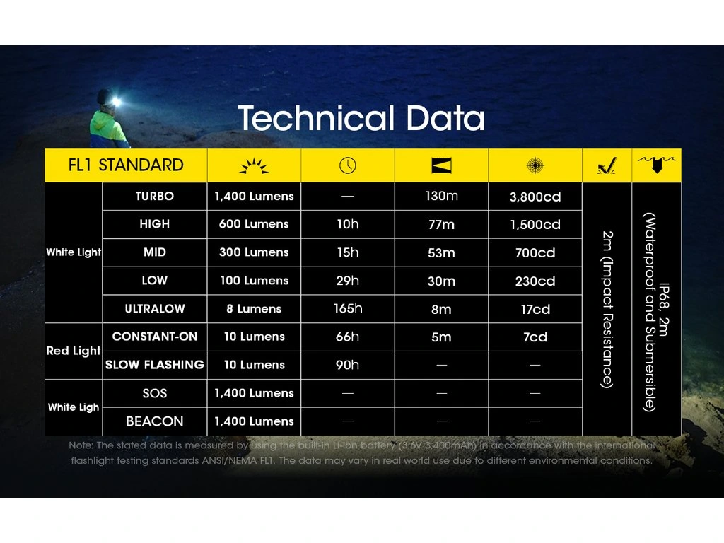 Svetelný výkon: 1400 lm, Dosvit: 130 m, Výdrž: 10 h (pre 600 lm).