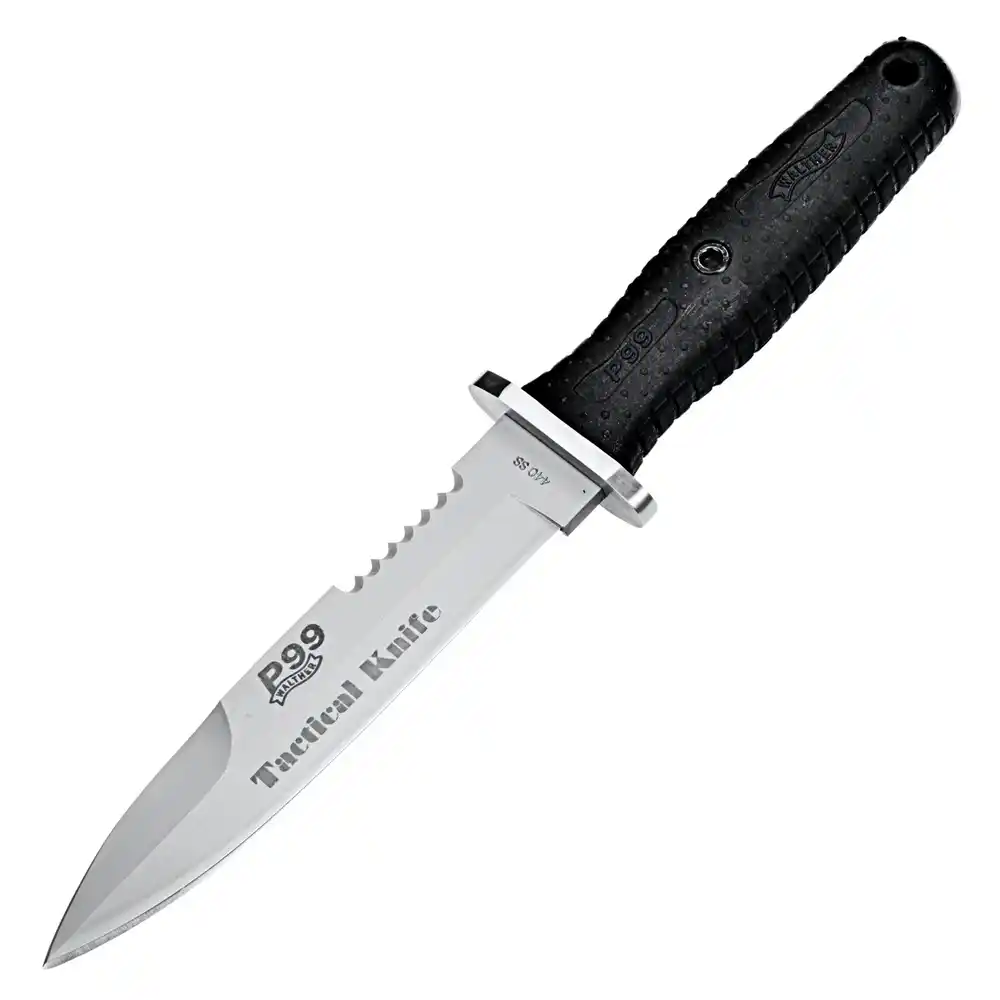 Bojový nôž Walther Tactical P99 je vybavený pevnou čepeľou typu Spear Point. Plocha čepele je potiahnutá ochrannou chemickou vrstvou Bead Blast. Nerezová oceľ 440C prepožičiava nožu tie najlepšie rezné vlastnosti, ľahko sa ostrí aj v poľných podmienkach. Ostrie je po celej dĺžke hladké, na chrbte noža nájdete vrúbkovannie. S ním rozrežete aj tvrdé a vláknité materiály.